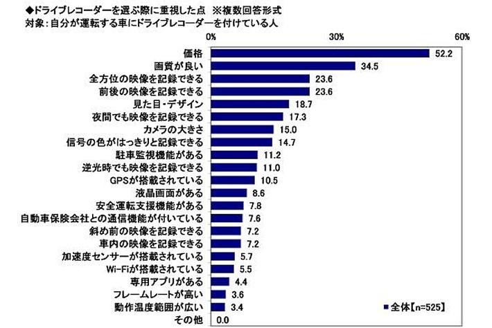 自分が運転する車にドライブレコーダーを付けている方525名に、ドライブレコーダーを選ぶ際に重視した点を聞いたところ、1位「価格」(52.2%)、2位「画質が良い」(34.5%)、3位「全方位の映像を記録できる」「前後の映像を記録できる」(いずれも23.6%)、5位「見た目・デザイン」(18.7%)となりました。