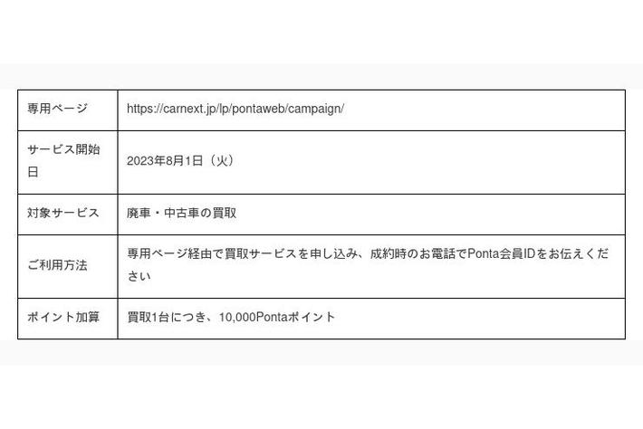 このたびの提携により、2023年8月1日(火)から、専用ページを経由して「カーネクスト」のサービスを利用すると、1台のご成約につき10,000Pontaポイントがたまるようになります。