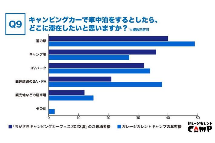 キャンピングカーで滞在したいと思う場所では「道の駅」が最も多く、移動と同時に旅行をしっかり楽しめる場所が人気だとわかりました。