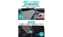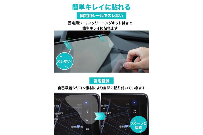 付属の固定用シールを使えば、大きなナビ画面でも位置合わせがしやすく、簡単に貼り付けが可能です。また、フィルムの粘着面には特殊シリコン素材を採用。これによりフィルムは自己吸着し、気泡は入りづらく抜けやすくなります。
