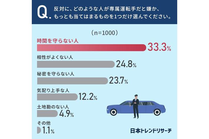 「反対に、どのような人が専属運転手だと嫌か?」といった問いには「時間を守らない人」がもっとも多く選ばれていました。