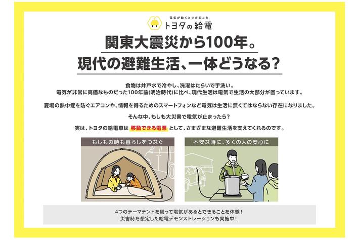関東大震災から100年 TOYOTAが給電車を活用した“これからの避難生活”を提案。「TOKYOもしもFES渋谷2023」2023年9月2日(土)、3日(日) 10:00~17:00