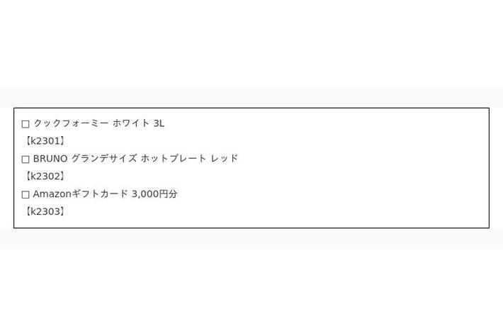 ・本キャンペーンについてtimy作業予約ページにアクセスして、洗車・オイル交換・コーティングのいずれかのメニューを選択し、応募する景品のキャンペーンコードを入力(●クックフォーミー ホワイト 3L 【k2301】 ●BRUNOグランデサイズホットプレートレッド【k2302】 ●Amazonギフトカード3,000円分【k2303】)して予約をしてください。※予約後に店舗で作業を実施した方のみが対象になります。※本キャンペーンは予告なく終了する場合があります。あらかじめご了承ください。