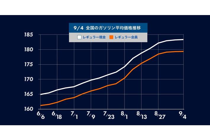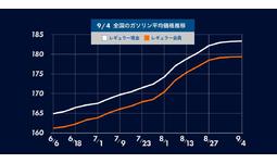 9月4日(月) 時点のレギュラーガソリンの全国平均は、183.3円となり先週から1.4円の値上がり。16週連続の値上がりとなりました。