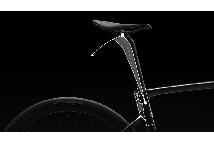 フロントのFuture Shockには、前後バランスの取れた走りを実現し、ライダーを完全に路面振動から切り離すパートナーがバイクのリア側に必要です。その役目を担うのがPave シートポストとドロップド・クランプデザイン。これらが一つとなり、AfterShock テクノロジーを形作っています。Pave シートポストは、路面からの突き上げで動いたリアアクスルと反対の後方へしなるよう、カーボンレイアップを配置。この動きがサドルに伝わる衝撃を軽減させます。しかし、その際に減速が生じることはなく、バイクのリア側の剛性を高く保つため、漕いだ力をダイレクトかつ効率的に路面に伝えられます。