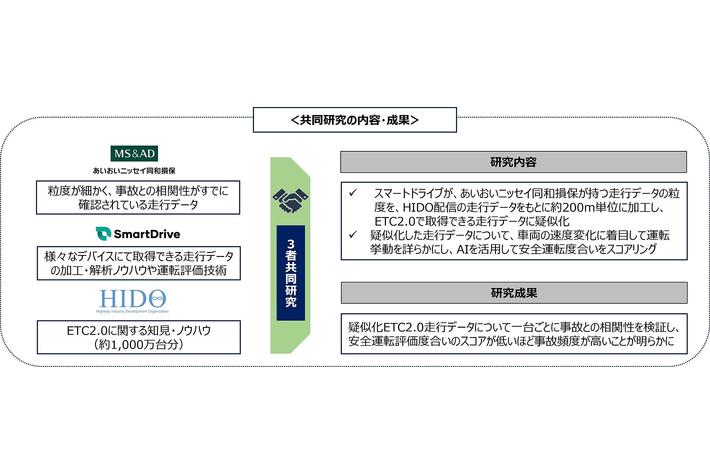そこで、コネクティッドカーや通信機能を持つドライブレコーダーなどのデバイスを活用してテレマ保険を展開するあいおいニッセイ同和損保と、ETC2.0に関連する仕様書の発行や運行管理支援サービス事業者等への走行データの配信を通じてETC2.0に関する情報処理・分析ノウハウを蓄積してきたHIDO、ならびにETC2.0を始めとする様々なデバイスにて取得できる走行データの加工・解析ノウハウや運転評価技術を有するスマートドライブは、2023年2月から、ETC2.0の走行データから算出した安全運転評価度合いのスコアと交通事故発生リスクの相関を確認するための共同研究に着手しました。