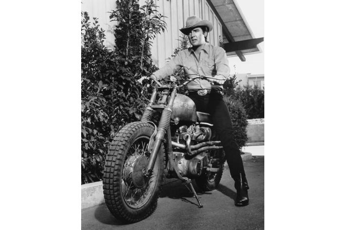 歴史上最大のセールスを記録したソロアーティスト、ハリウッドで31本の映画に出演した映画スターでもあることが、それを物語っています。そしてエルヴィスは無類のバイク愛好家でもあり、映画の中でもバイクを乗りこなしています。例えば、1968年のコメディウエスタン映画『Stay Away Joe』では、レッドとシルバーのTriumph 650 Bonneville「Desert Sled」に乗っているシーンがあります。