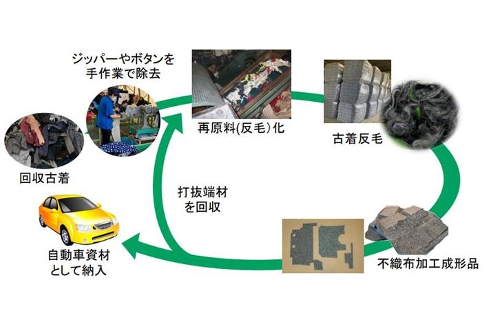 ニッケグループの株式会社フジコー(以下、フジコー)では、従来から一関工場(岩手県一関市)において古着を再原料化し、自動車用部材に使用する取組みを行って来ましたが、ボタン・ファスナー等の除去を人手に頼る(下図2.)為、コスト高となり処理量も限定されています(この異物除去については、上記の経済産業省「報告書」においても、国内の資源循環システム構築上の課題として指摘されています)。