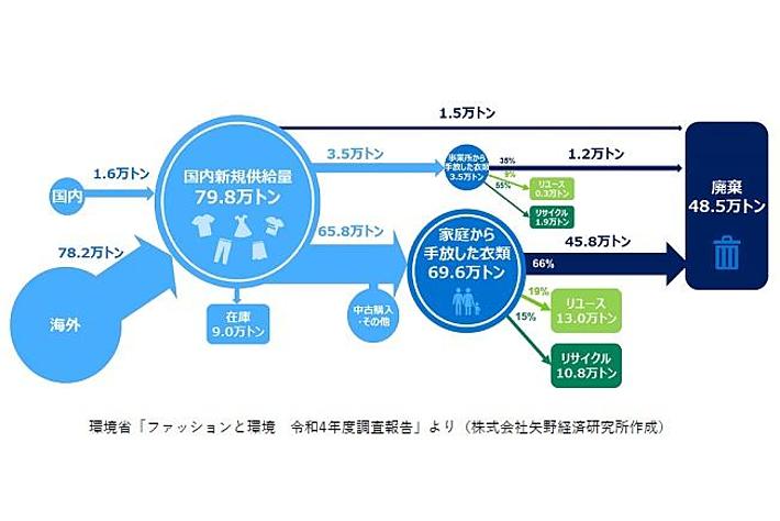 一方で、2022年度の環境省「循環型ファッションの推進方策に関する調査」によれば、2022年の衣類の国内新規供給量79.8万トンに対し、73.1万トンが使用後に手放され、その64.5%相当の 47.0万トンが廃棄されています(下図1.)。こうした状況から、衣料品の廃棄量を削減し環境負荷の低減を進めていくことが必要となっています(経済産業省「繊維製品における資源循環システム検討会報告書(2023年09月28日)」)。