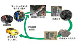 ニッケグループの株式会社フジコー(以下、フジコー)では、従来から一関工場(岩手県一関市)において古着を再原料化し、自動車用部材に使用する取組みを行って来ましたが、ボタン・ファスナー等の除去を人手に頼る(下図2.)為、コスト高となり処理量も限定されています(この異物除去については、上記の経済産業省「報告書」においても、国内の資源循環システム構築上の課題として指摘されています)。