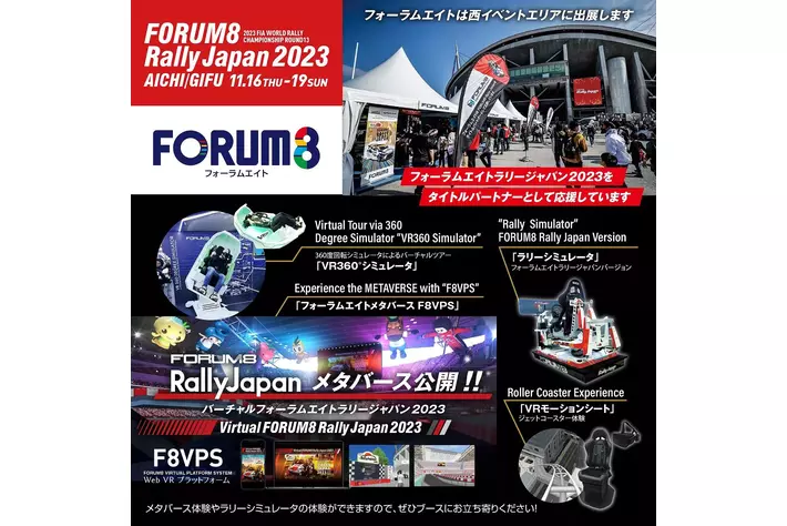 独自のコースをラリーシミュレータで走行、SDGs海底ゴミ拾い、360度回転、ジェットコースターで手に汗握る。現実と融合AR、F8VPSでメタバース体験を。FORUM8はRallyJapanの冠スポンサーです。
