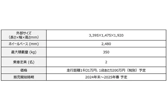 新しい軽自動車サイズの商用EV「PUZZLE」は、コンセプトカーを元にした量産モデルの計画が進んでおり、2024年末~2025年春での販売を目指しています。また、価格は走行距離1キロ1万円、1台あたり200万円(税別)を予定しています。