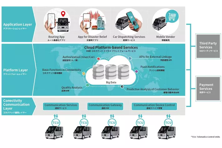 HW ELECTROのプラットフォームサービスは、車両とインターネットをつなぎ、災害支援や配送領域の最適化をはじめとした利便性の高いDX環境の提供を目指したサービス基盤となります。車両データはネットワークを通じプラットフォームに蓄積され、プラットフォーム上で解析されたデータは様々なアプリケーションやシステムと連携し、新たなサービスとして価値を生み出します。(動画URL:https://hwelectro.co.jp/)