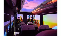コンテンツ体験バスで、車両の位置情報に合わせて、モニターや透明ディスプレイ、天井にコンテンツが再生され、車窓の景色に連動したVR/AR体験を提供します。