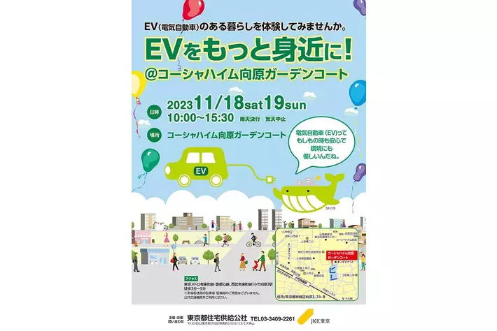 東京都の政策連携団体であるJKK東京(東京都住宅供給公社:東京都渋谷区、理事長:中井敬三、以下「JKK」という。)は、集合住宅における電気自動車(以下「EV」という。)の利用とEV充電設備設置の機運を醸成するため、東京都(以下「都」という。)と連携し、板橋区向原にあるJKK住宅※「コーシャハイム向原ガーデンコート」おいて、大人も子どもも楽しめるEV普及啓発イベントを11月18日(土曜日)と19日(日曜日)に開催します。