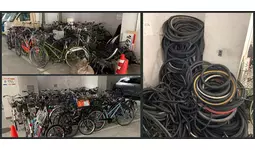 サイクルベースあさひ広島舟入店では、お客様の古くなった自転車の引き取りも行っています。月に一回、ゴムチューブなどの廃棄物を業者に引き取りいただいています。引き取りまでの間は、店舗の駐車場に自転車を保管しています。トレジャーハンティング当日は43台の自転車が並べられ、その横には大量の自転車タイヤ・ゴムチューブが積まれていました。保管している自転車は、パンクしているものや車体の歪みがあるもの、状態は様々ですが、自転車のフレーム・ハンドル・チェーン・ギアなど、個々のパーツは使用できるものが多く、ごく稀にほぼ新品という状態の自転車もあります。