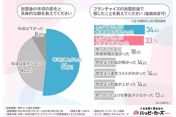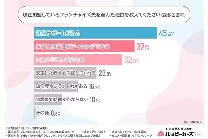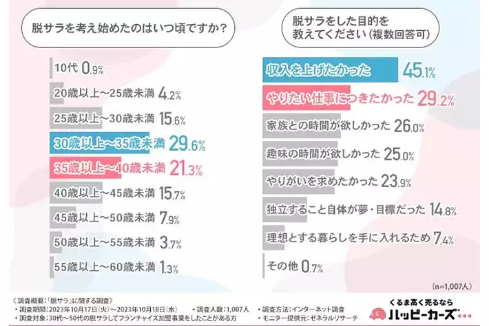 株式会社ハッピーカーズ(所在地:神奈川県鎌倉市、代表取締役:新佛 千治)は、30代~50代の脱サラしてフランチャイズ加盟事業をしたことがある方を対象に「脱サラ」に関する調査を実施しました。