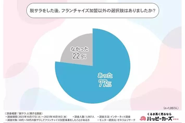 「脱サラ後、フランチャイズ加盟以外の選択肢はありましたか?」と質問したところ、およそ8割の方が『あった(77.1%)』と回答しました。