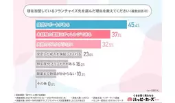 「現在加盟しているフランチャイズ先を選んだ理由を教えてください(複数回答可)」と質問したところ、『経営サポートがある(45.4%)』と回答した方が最も多く、次いで『未経験の業種にチャレンジできる(37.1%)』『失敗のリスクが少ない(32.5%)』『安定した収入を保証してくれる(23.0%)』『知名度やブランド力がある(16.2%)』と続きました。