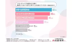 「フランチャイズ加盟をする際に確認しておくべきだと思うことを教えてください(複数回答可)」と質問したところ、『サポートが手厚いか(41.0%)』と回答した方が最も多く、次いで『加盟金や更新料などの費用(38.8%)』『未経験者でも加盟できるか(36.4%)』『収入保証があるか(31.8%)』『知名度やブランド力があるか(15.5%)』と続きました。