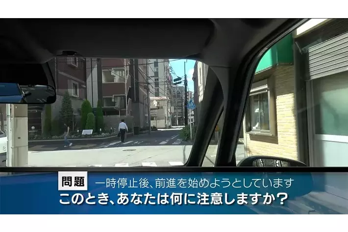 建物の密集する商店街付近の一方通行路を走行しています。一時停止後、安全確認をして前進を始めますが…