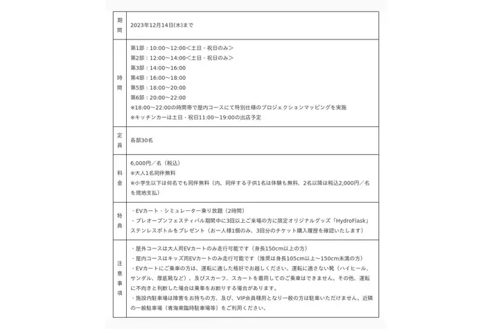 プレオープンフェスティバルのチケットは、「CITY CIRCUIT TOKYO BAY」公式サイト( https://city-circuit.com/ )で引き続き発売中です。グランドオープンのチケットは同じく公式サイトにて12月上旬に発売予定で、チケット種・価格等の販売概要は決定次第お知らせします。