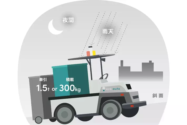 eve auto(R)は主に工場や物流施設の屋内外において、「今日から、自動化」をコンセプトに環境への工事不要でスタートできるガイドレス自動搬送システムです。屋外における雨天などの天候環境、段差や傾斜といった路面環境の厳しい条件下でもレベル4の自動運転を実現し、既に多くのお客様に提供しています。