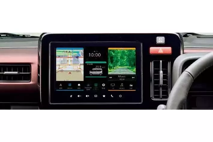 新型「スペーシア」、「スペーシア カスタム」は、広くて使いやすい室内空間がより快適に進化し、充実した安全機能を搭載した軽ハイトワゴンタイプの軽乗用車です。同車両に採用されたカーナビゲーションは、9インチの高精細HDディスプレイを搭載し、見やすい地図と分かりやすい案内表示で目的地までの最適なルートを案内します。HDMI入力や、スマートフォンと連携させる「Apple CarPlay」「Android AutoTM」に対応するなど、多様なメディアを再生でき、スズキ販売会社装着アクセサリーのドライブレコーダーとの連動も可能です。また、「ナビゲーション」「車両情報」「オーディオ」が分かれたエリア表示で多彩な機能を簡単に操作でき、カスタマイズも可能なホーム画面を採用しています。さらに、スズキコネクトのサービスと連携することで、ナビ画面上に各種通知を表示したり、スズキトラブルサポートへの発信操作を行えます。
