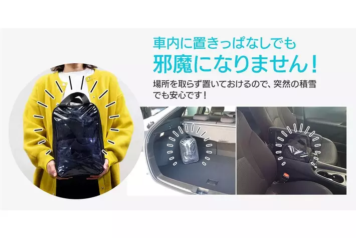 車のトランクなどに置いても場所を取らないので、シーズン中は車に備えておけば、急な積雪に遭遇しても困りません。