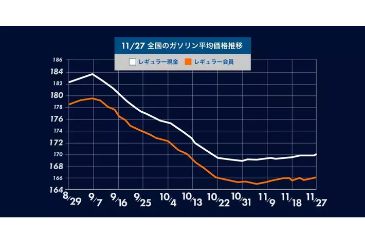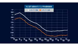 11月27日(月) 時点のレギュラーガソリンの全国平均は、170.1円となり先週から0.4円の値上がり。4週連続の値上がりとなりました。