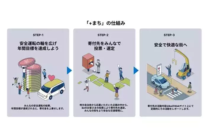 「+まち」とは、「事故時の安心だけでなく、事故のない世界そのものを、お客さまと共創する。」をミッションに掲げる「&e」において、「安全な交通環境・社会の実現」をテーマに地方自治体から企画を募集し、お客さまの投票によって企画を選定し、お客さまの事故率に応じて当社が寄付を行う活動です。