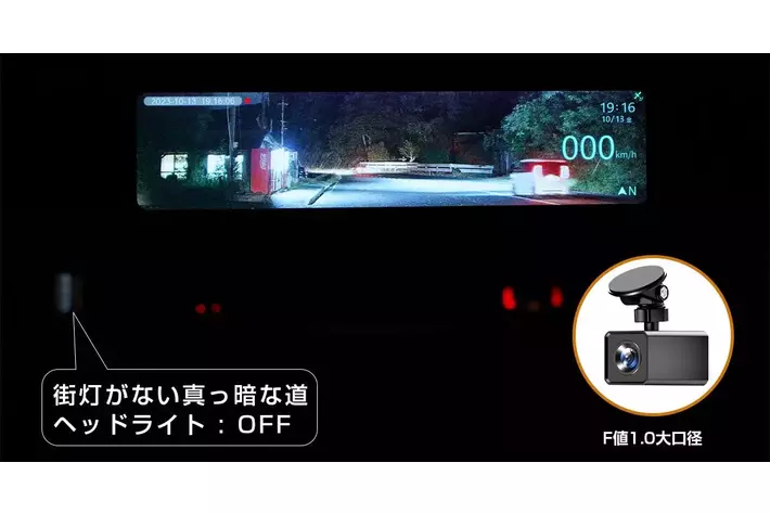 F値の値が「小さく」なると、レンズから入ってくる光の量が「増えて」明るく撮影できます。F1.0は一般に「人間の目と同じ明るさ」と言われており。街灯の少ない郊外から山道、雨が降る夜道などをくっきりバッチリと捉える!
