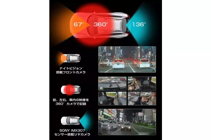 リヤカメラ:水平134° 広角レンズ(SONY IMX307 + 後方広範囲を記録するための画角)