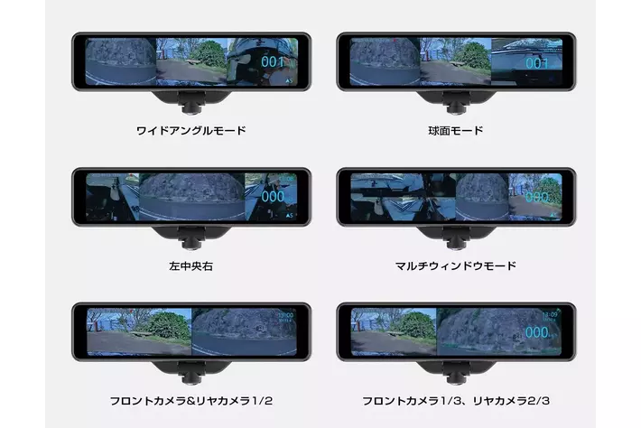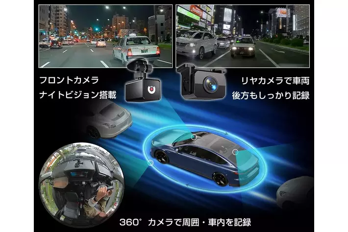 360°全方位カメラ:水平視野角360° + 垂直視野角220° パノラマレンズ(前後・左右・車内の映像を全方位で記録)