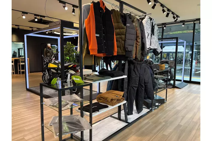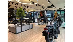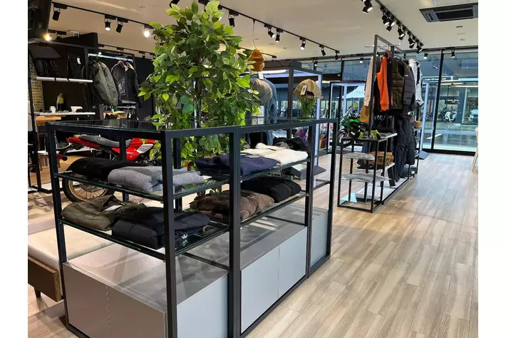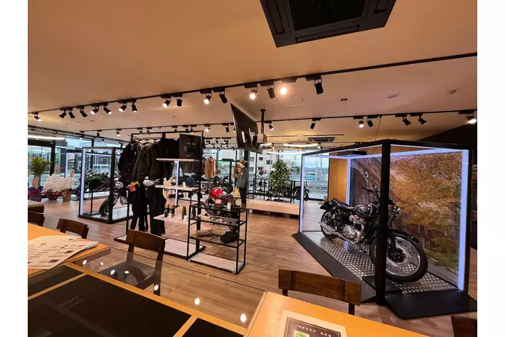 「五感で楽しめる空間」をコンセプトとするショールーム。店舗デザインや展示スタイルだけでなく、音楽、香り、味覚まで調和された独自の世界をお楽しみください。モーターサイクルライフを想像しながら最新のモデルをご覧いただけます。