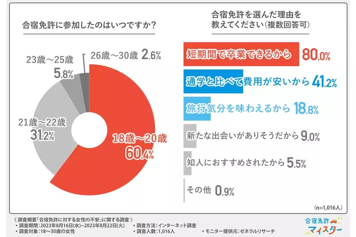 そこで今回、合宿免許比較サイト「合宿免許マイスター(https://menkyo-meister.com/)」を運営する株式会社サクラスは、1人で免許合宿に参加したことがある、普通免許を持つ18~30歳の女性1,016名を対象に「合宿免許に対する女性の不安」に関する調査を実施しました。