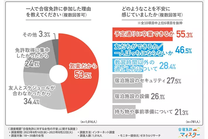 今回の調査で、1人で合宿免許に参加した女性が感じていた不安について明らかになりました。