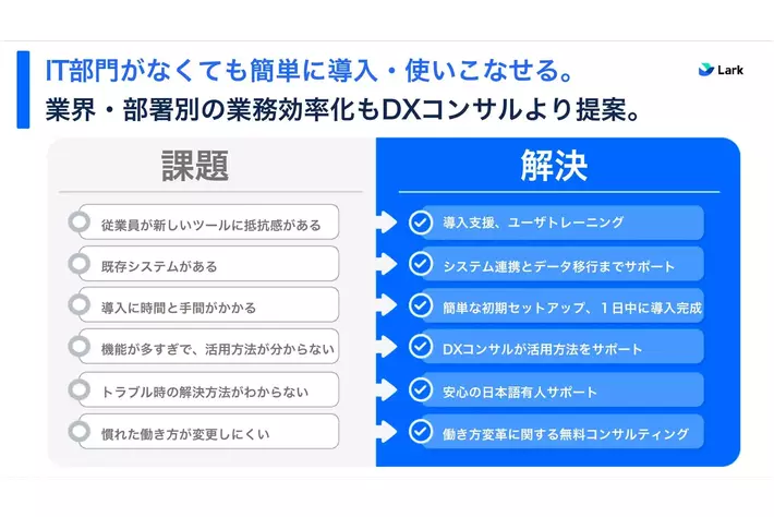 そして、これらの課題に対する明確な解決策として、Larkの導入と実演を通じて実践的なソリューションをご紹介します。さらに、成功事例を通して、現場で直面する問題への具体的な答えを提供します。