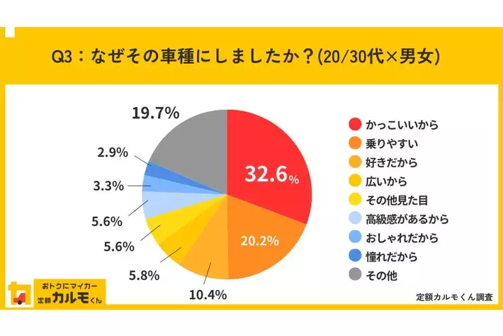 続いて、なぜその車種を選んだのか理由を聞いたところ、最も多かったのは「かっこいいから」で32.6%でした。具体的には「大人っぽいから」「SUVでかっこいいから」といった理由が挙げられました。多かったは「乗りやすい」で20.2%でした。「安定感があるから」「運転しやすいから」といった意見が多く、普段乗り慣れている車でドライブデートしたいと考えている人が多いようです。世代別でみても、上位の理由に大きな差はみられませんでした。