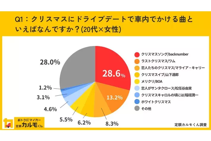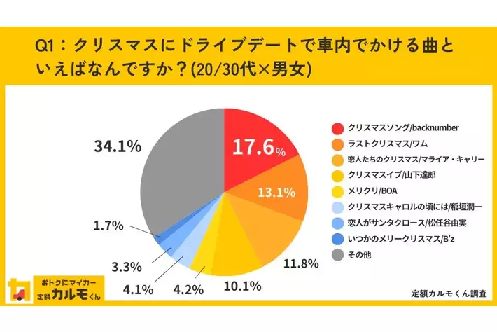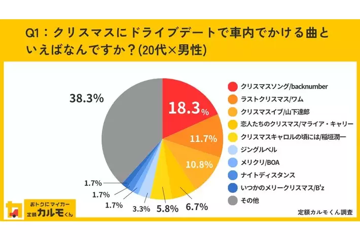 クリスマスにドライブデートで車内でかけたい曲について聞いたところ、1位は「クリスマスソング/backnumber」で17.6%でした。続いて2位は「ラストクリスマス/ワム」で13.1%、3位は「恋人たちのクリスマス/マライア・キャリー」で11.8%でした。