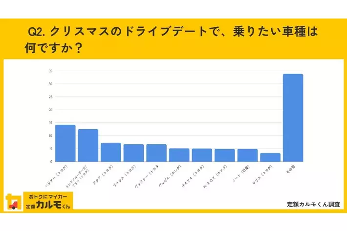 続いて、クリスマスのドライブデートで乗りたい車種について聞いたところ、1位は「ハリアー(トヨタ)」で14.3%でした。続いて多かったのは「ランドクルーザーW/プラド(トヨタ)」で 12.6%、「アクア(トヨタ)」7.3%でした。上位には、SUVのほかコンパクトカーが選ばれる傾向であることがわかりました。