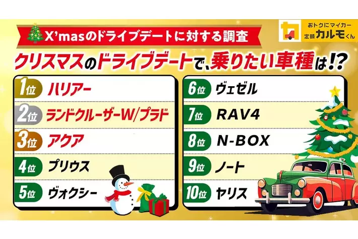 クリスマスデートで乗りたい車No.1は「ハリアー」ドライブデートでかけたい曲No.1は backnumberの「クリスマスソング」