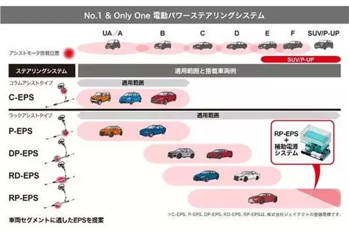 ジェイテクトは1988年に世界で初めてEPSを開発・量産を開始して以来、現在に至るまで世界シェアNo.1*であり、全てのアシストタイプのEPSを提供できるOnly Oneのステアリングシステムサプライヤーです。