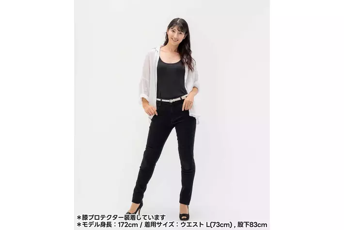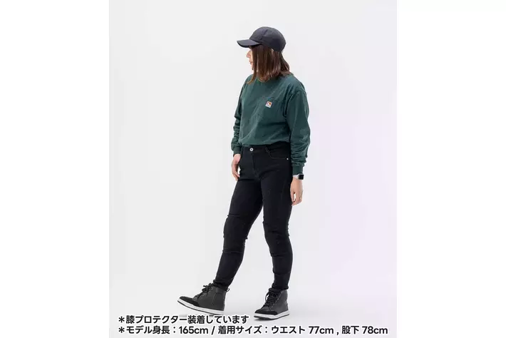 このブラックスキニーは、「全ての女性ライダーにスキニーを」をコンセプトに脚細脚長効果・美脚美尻効果を得る事ができる設計。バイクに乗った時も降りた時も常に美しいシルエットを目指してパターンを開発しています。