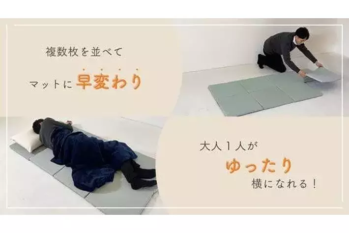 8枚を並べればシングルベッドサイズ(0.9m x 1.8m)で、ゆったり使える