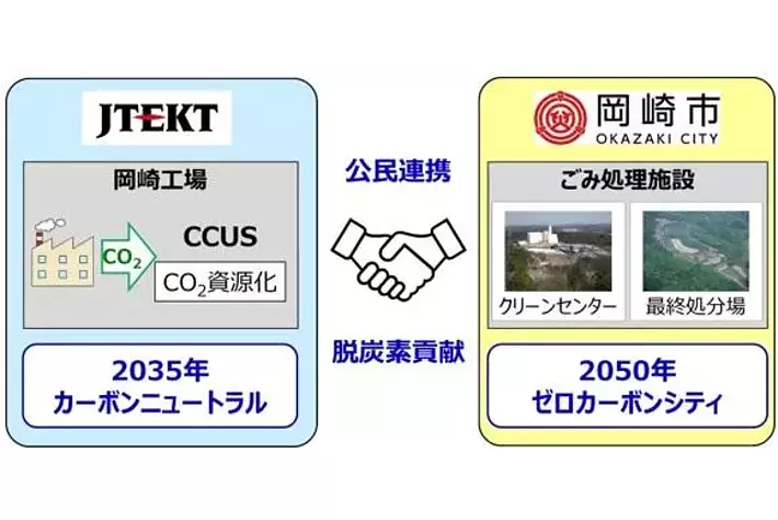 株式会社ジェイテクト(本社:愛知県刈谷市、取締役社長:佐藤和弘、以下「ジェイテクト」)は愛知県岡崎市とCO2直接回収システムの地域実証に向けた協定を締結しました。本システムは企業活動にともない排出されるCO2を自社開発したCCUSにより資源化し、岡崎市のごみ処理施設で活用する試みです。まずは、ジェイテクト岡崎工場で排出されるCO2を年間50トン級回収・資源化するCCUSシステムにより、地域実証に向けた検討、協議を開始します。