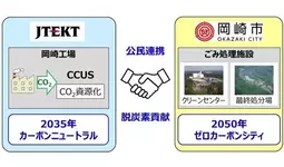 株式会社ジェイテクト(本社:愛知県刈谷市、取締役社長:佐藤和弘、以下「ジェイテクト」)は愛知県岡崎市とCO2直接回収システムの地域実証に向けた協定を締結しました。本システムは企業活動にともない排出されるCO2を自社開発したCCUSにより資源化し、岡崎市のごみ処理施設で活用する試みです。まずは、ジェイテクト岡崎工場で排出されるCO2を年間50トン級回収・資源化するCCUSシステムにより、地域実証に向けた検討、協議を開始します。