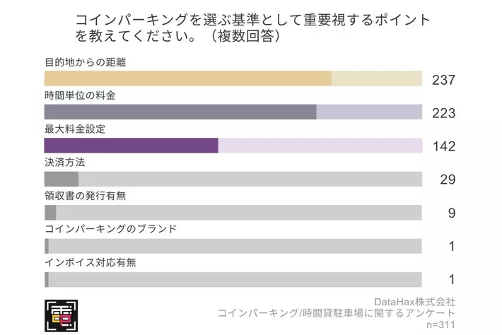 ・コインパーキングを選ぶ基準として多くの人が「距離」と「時間単位料金」を重視