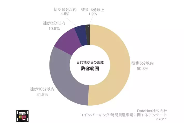 「Q.目的地からのコインパーキングまでの距離の許容範囲を教えてください。」(n=311)と質問したところ、「徒歩5分以内」が50.8%ともっとも高く、次いで「徒歩10分以内」31.8%、「徒歩3分以内」10.9%、となりました。