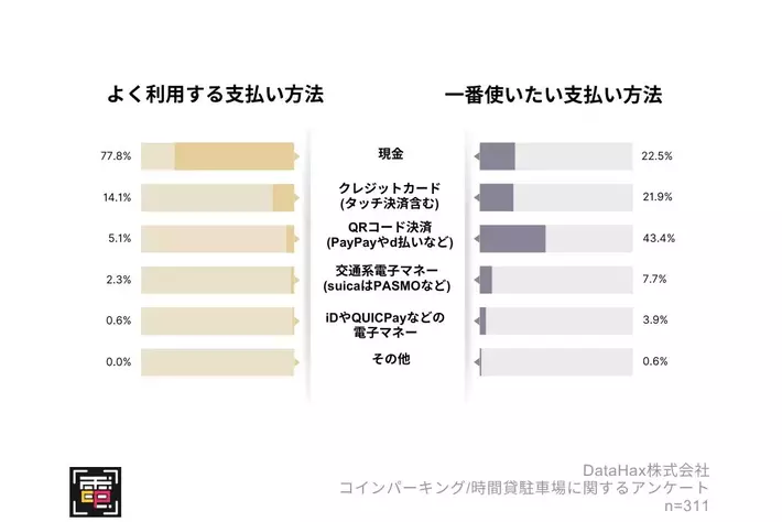 一方で、「Q.コインパーキング/時間貸駐車場で一番使いたい決済方法を教えてください。」(n=311)と質問したところ、「QRコード決済(PayPayやd払いなど)」43.4%、「クレジットカード(タッチ決済含む)」21.9%と高い支持を受ける結果となり、「現金」の支持率は22.5%と実態とは真逆の結果となりました。